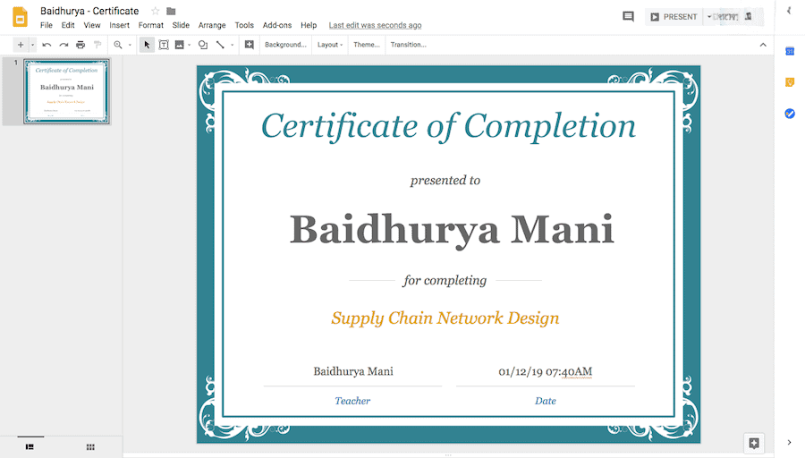 First, you must customize the visual appearance of the certificate template, a process that is identical to editing any other presentation in Google Slides. I will leave this creative step to you, so you can adjust the design to align with your specific branding and requirements.