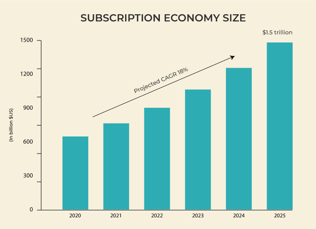 The global subscription market was worth 650 billion USD in 2020 and is expected to reach 1.5 trillion USD by 2025.