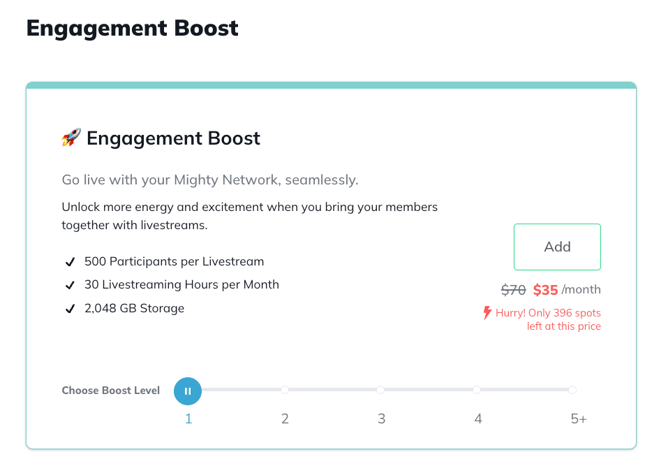 Besides these plans, you can purchase Engagement Boosts. These serve as add-ons for buying extra storage and livestreaming hours and allowing more participants in livestreams. There are five different options known as Engagement Boost levels.