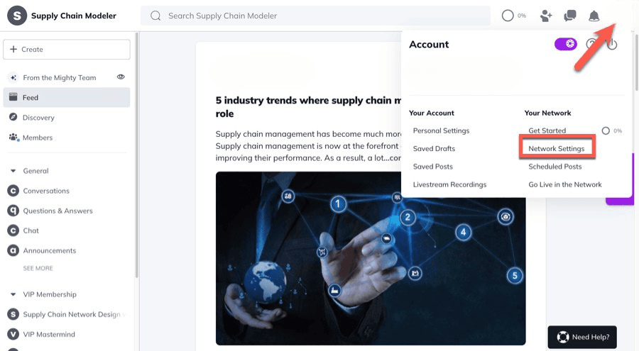 To commence the customization of your community, click on your profile icon and then choose Network Settings from the options provided.
