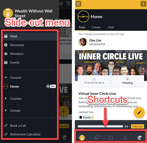 The Wealth Without Wall Street application delivers an impressive user experience. Upon authentication, users immediately encounter the activity timeline. This central feed aggregates all discussions, scheduled events, and content contributions, with customization options allowing personalization based on individual preferences.