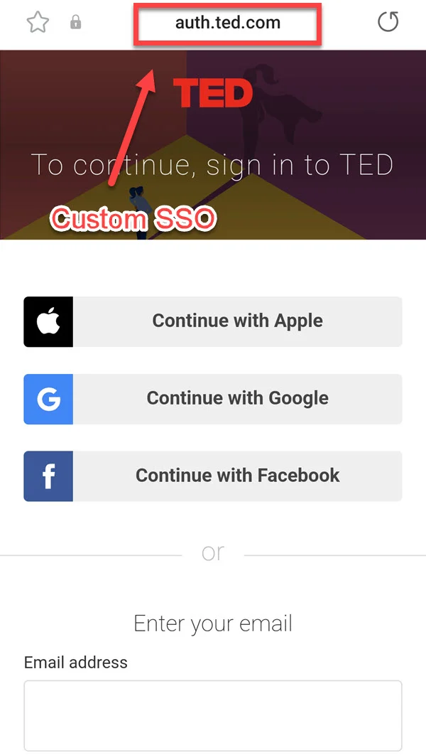Our evaluation continued with analysis of TED Community, another implementation example. Upon downloading this application and initiating the authentication process, users are redirected to an external authentication portal requiring credentials from their established TED account.