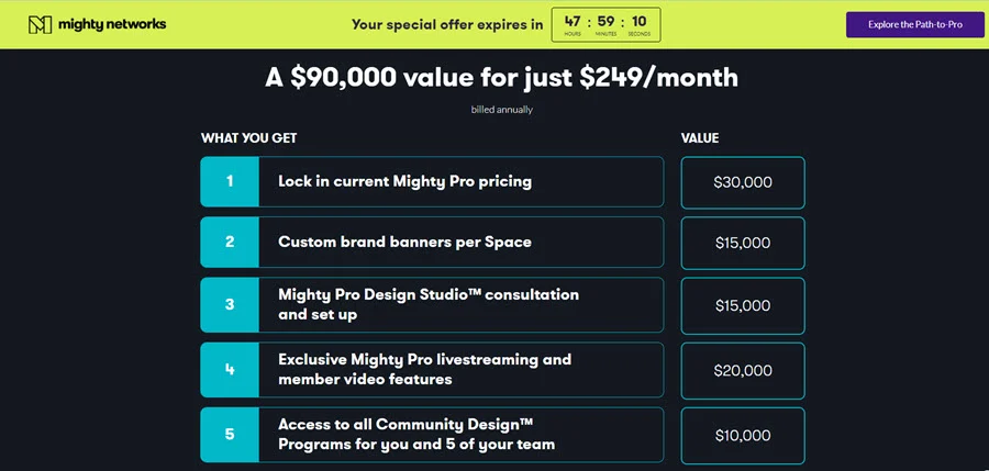 Mighty Pro costs $30,000 per year, but the price isn’t publicly listed. We picked the price from the landing page for their Path-to-Pro offer, and this has also been mentioned in the Mighty Community.