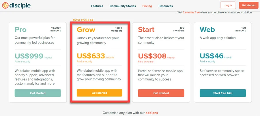 Consider Disciple—another recognized community management solution—which provides custom-branded applications beginning at approximately $7,596 annually through their Grow subscription tier.