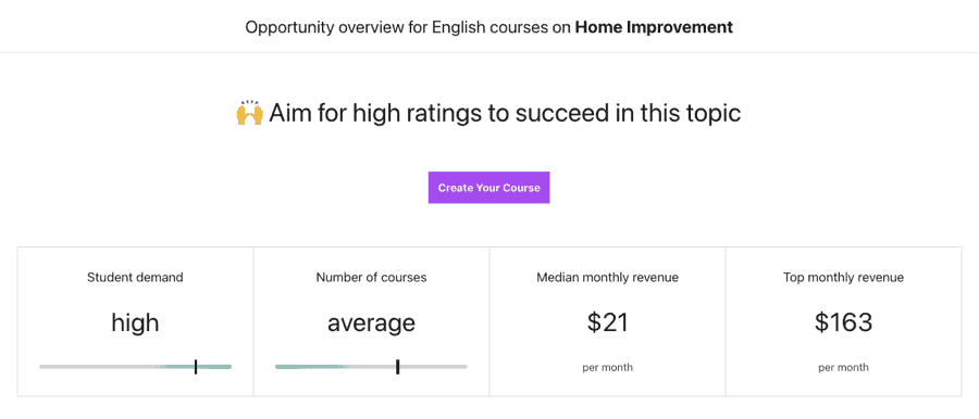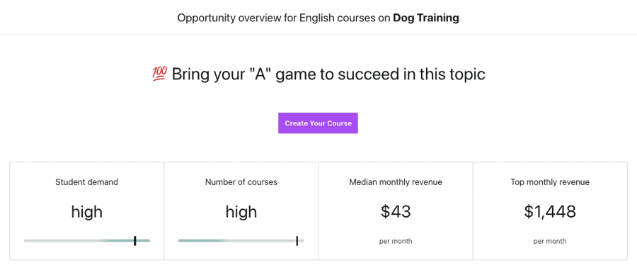 An equally effective method for concept validation involves examining existing Udemy offerings. You can investigate any specific terminology using the Udemy Marketplace Insights tool, which delivers comprehensive information regarding learner interest, market saturation, and typical monthly earnings potential.