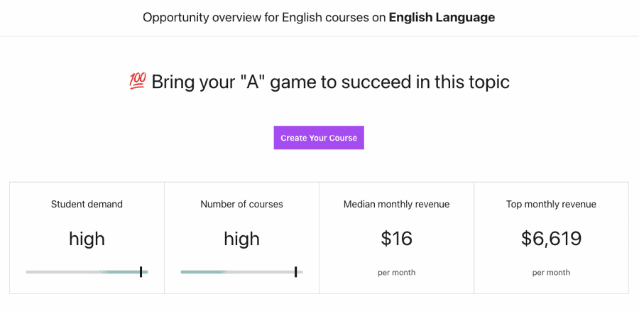 When examining the “English Language” category on Udemy’s platform, you’ll discover it ranks exceptionally well for both learner engagement metrics and income generation potential.