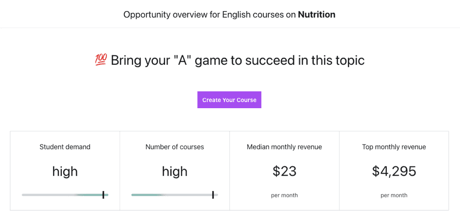 The marketplace data from Udemy further validates this sector’s remarkable potential. For instance, when examining the “Nutrition” subcategory through their Marketplace Insights feature, you’ll discover substantial student interest and impressive monthly earnings among leading courses.
