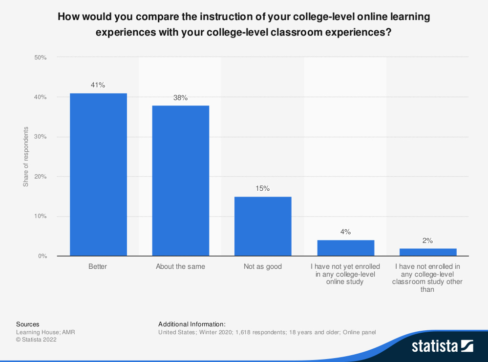 41% of students report having a better experience learning online than in a classroom setting. In addition, 89% of online degree graduates reported having a positive ROI from their program.