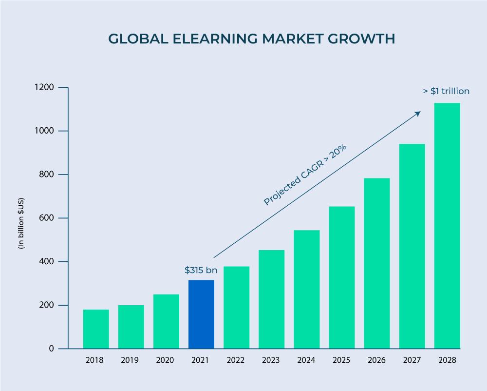 The global eLearning market surpassed $315 billion in 2021 and is expected to become a $1 trillion market by 2028.