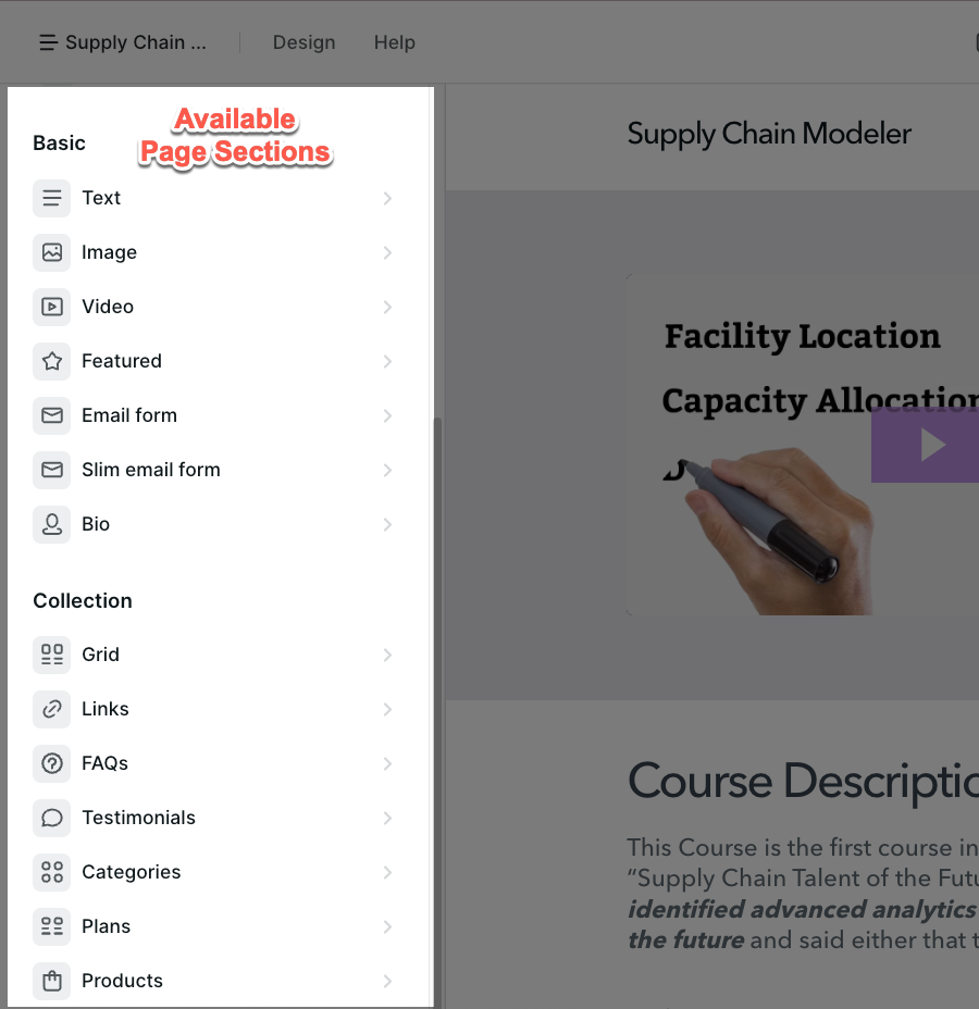 The page editor includes numerous ready-made segments available for insertion onto your page. These encompass areas for product showcases, course summaries, creator profiles, frequently asked questions, client endorsements, email capture forms, pricing tiers, among others. It additionally accommodates fundamental components like text blocks, pictures, and video embeds.
