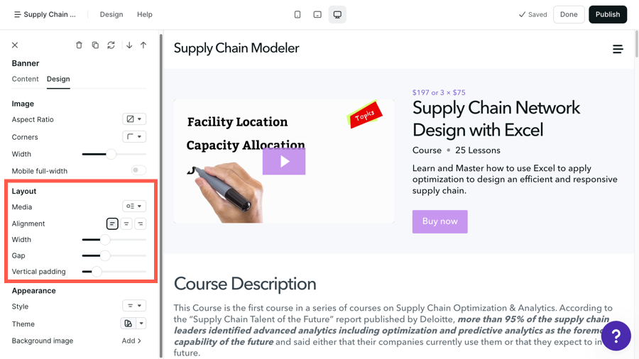 Podia additionally offers several choices for altering the placement of components within a particular segment. For instance, within the product showcase area, you can shift the media component to the left, right, top, or bottom relative to the accompanying text.