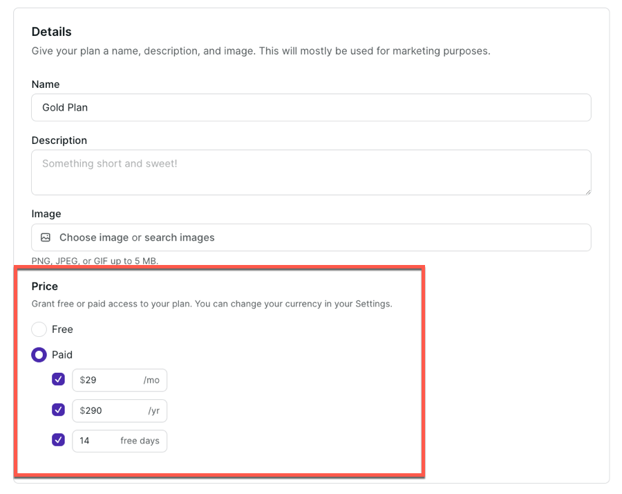 For subscription structures, you have the flexibility to bill monthly or annually and can also incorporate free trial access. Charging an initial setup fee, however, is not an available option.