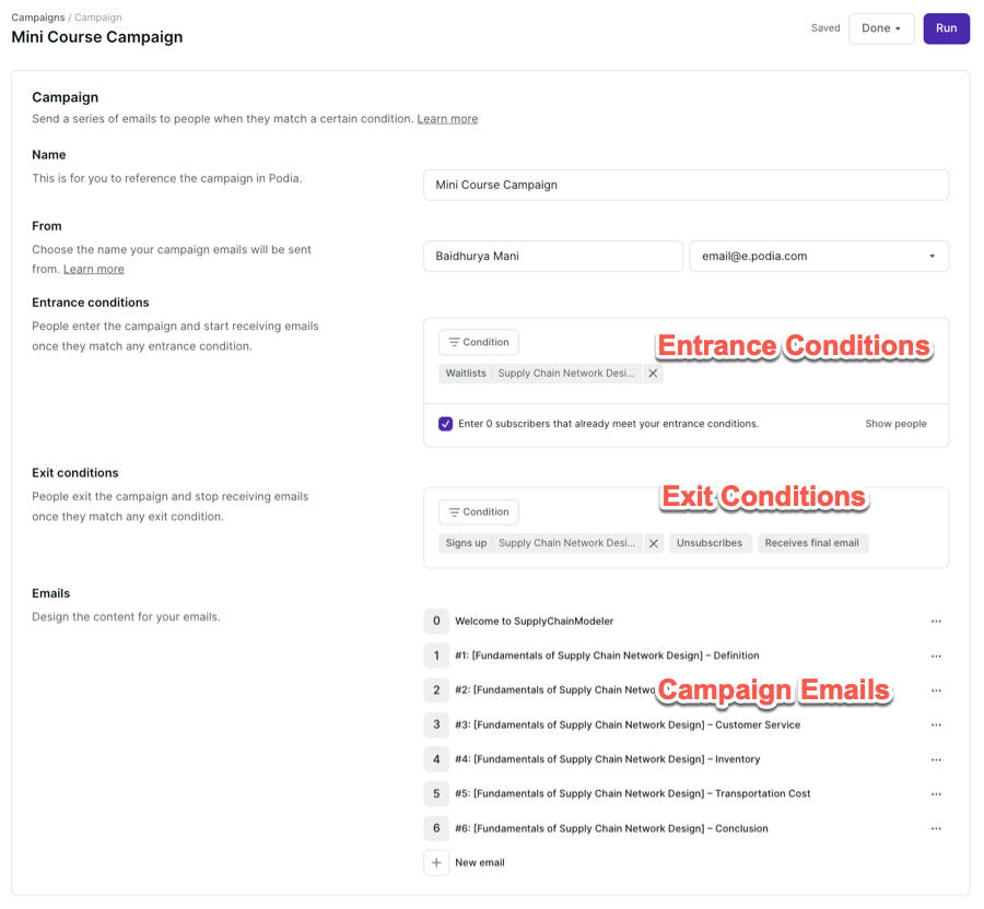 Automated email campaign in Podia