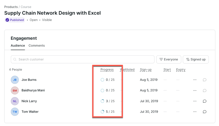 Podia’s course reporting functionalities have notable limitations, and some essential data points are unavailable. The principal tracking feature permits monitoring the progress of students within one specific course.