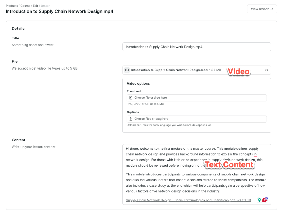 Beyond the primary content format, the lesson creation tool features a text area for including additional information. You can also utilize this space for incorporating downloadable materials and embedded content.