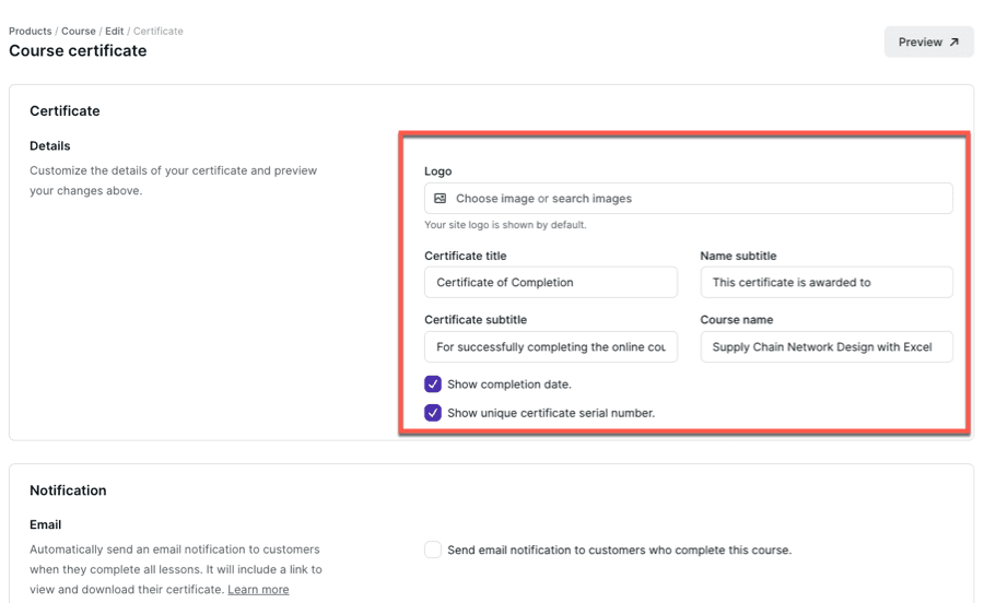 Turning to certificates, Podia empowers you to design and issue credentials to learners when they successfully conclude a course program.