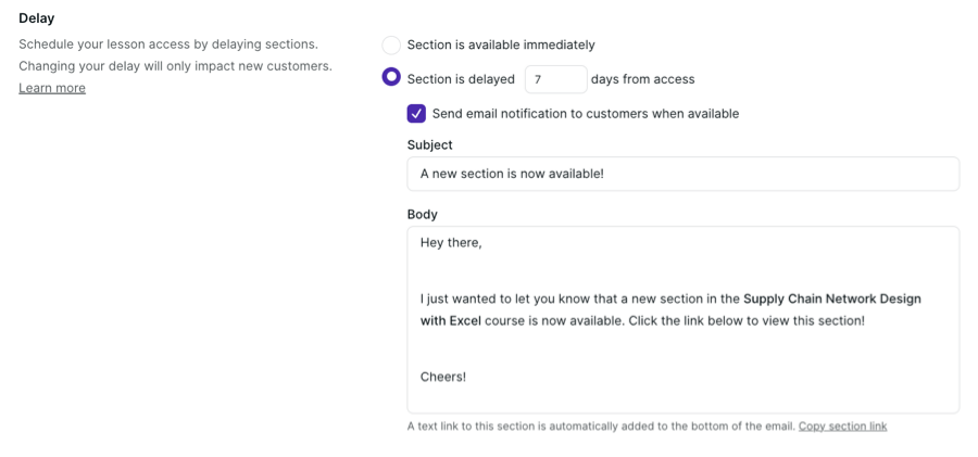 Podia’s content dripping settings