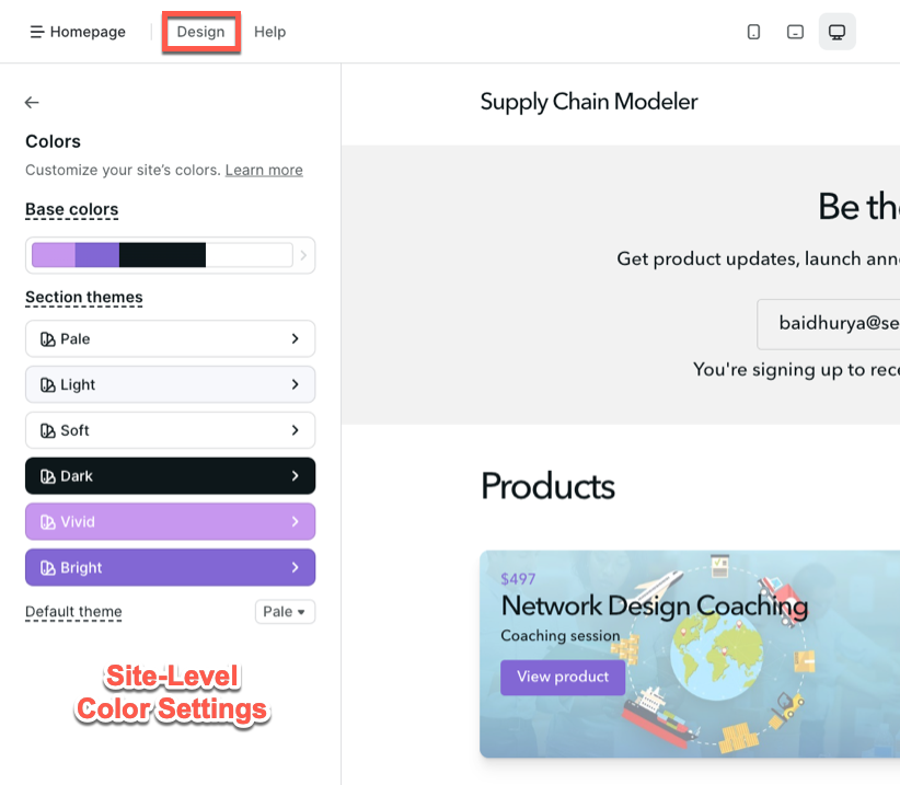 Podia’s site level design settings
