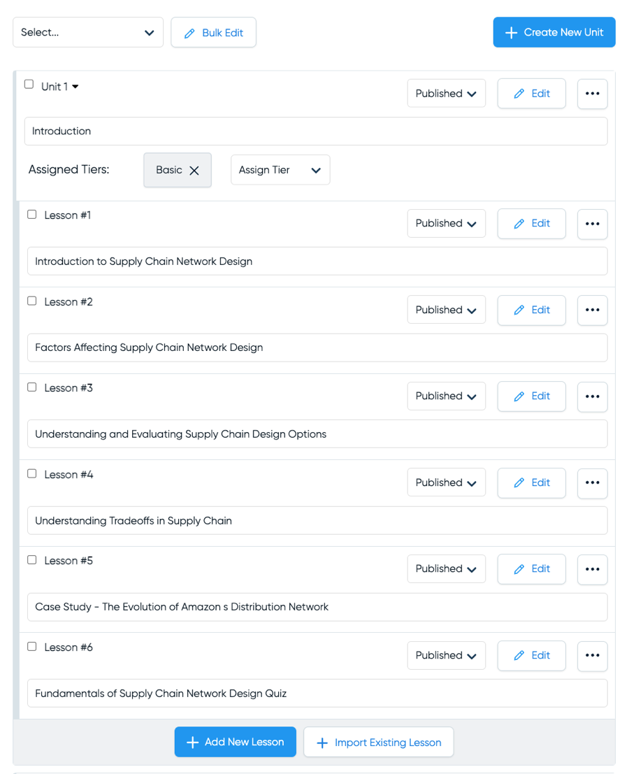 SamCart Courses features a straightforward course construction interface designed for organizing your educational material using units (which function like sections) and individual lessons. The primary content actually resides within the lessons, whereas units serve the purpose of logically categorizing related lessons together for better structure.