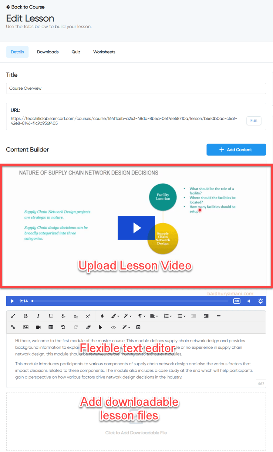 The lesson editing interface provided by SamCart exhibits considerable adaptability. You can incorporate video, written content, pictures, data tables, downloadable resources, and hyperlinks. Numerous formatting choices are available too.