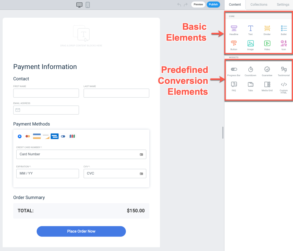 Additionally, the checkout page construction tool includes all essential components—client endorsements, trust symbols, highlighted sections, textual content, visual elements, and others.