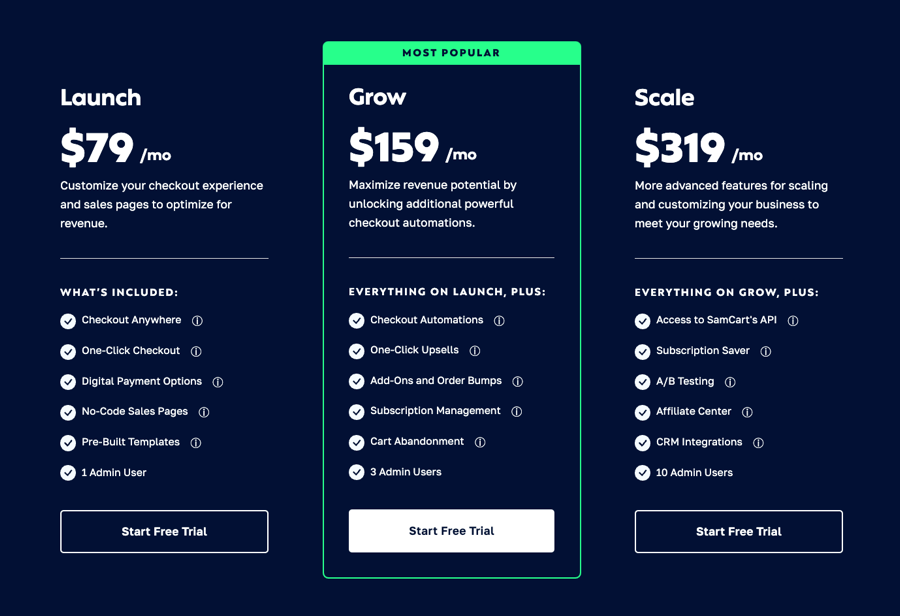 SamCart offers subscription tiers beginning at $79 monthly, with their most frequently chosen package priced at $159 per month. Although these plans vary concerning their checkout functionalities, the capabilities for course creation and delivery remain consistent across all available options.