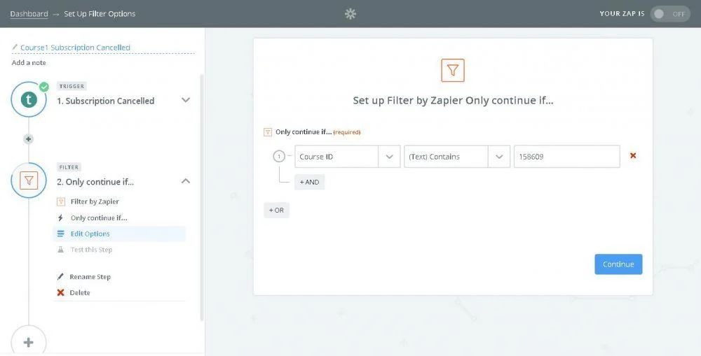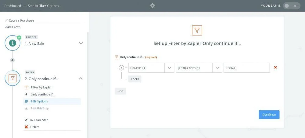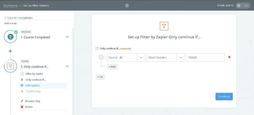 Next, you’ll need to establish the specific filtering condition. Choose ‘Course ID’ as your primary condition parameter, select ‘(Text) Contains’ from the dropdown menu, and enter the unique course ID for the specific course this Zap will monitor. Then click the ‘Continue’ button to proceed.