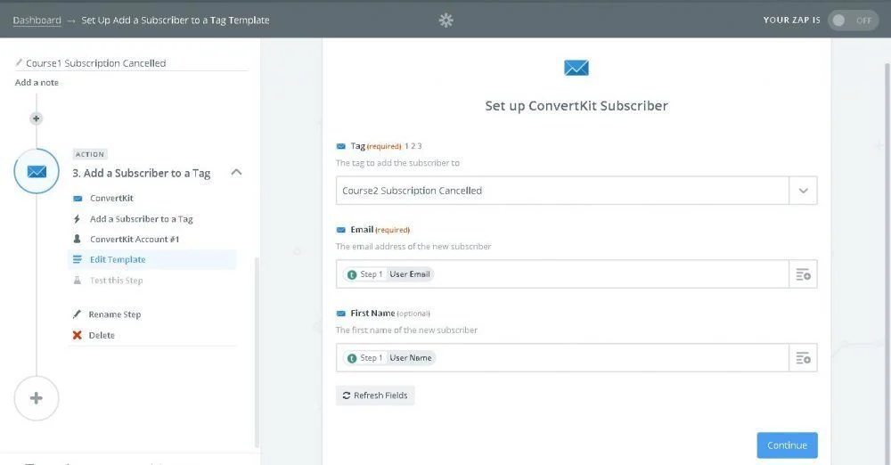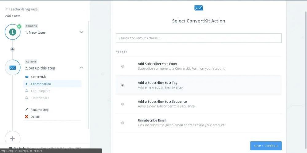 Choose ConvertKit as your Action App. Next, select ‘Add a Subscriber to a Tag’ from the available ConvertKit Actions, then proceed by clicking the ‘Continue’ button.