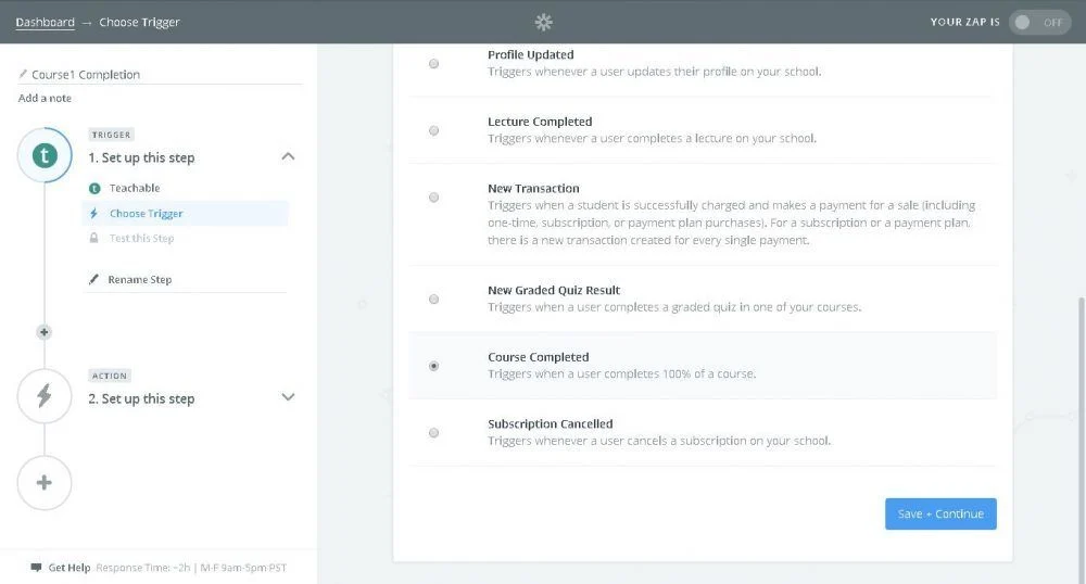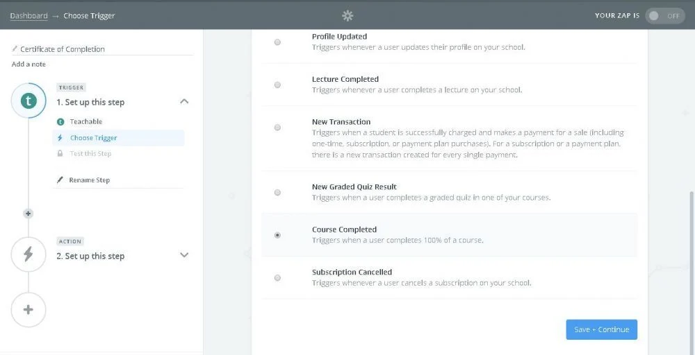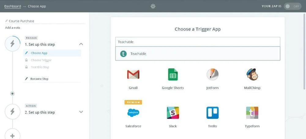 2. Configure the Trigger App for your automation You’ll need to provide a name for your Zap and select Teachable as your Trigger App for this particular automation.