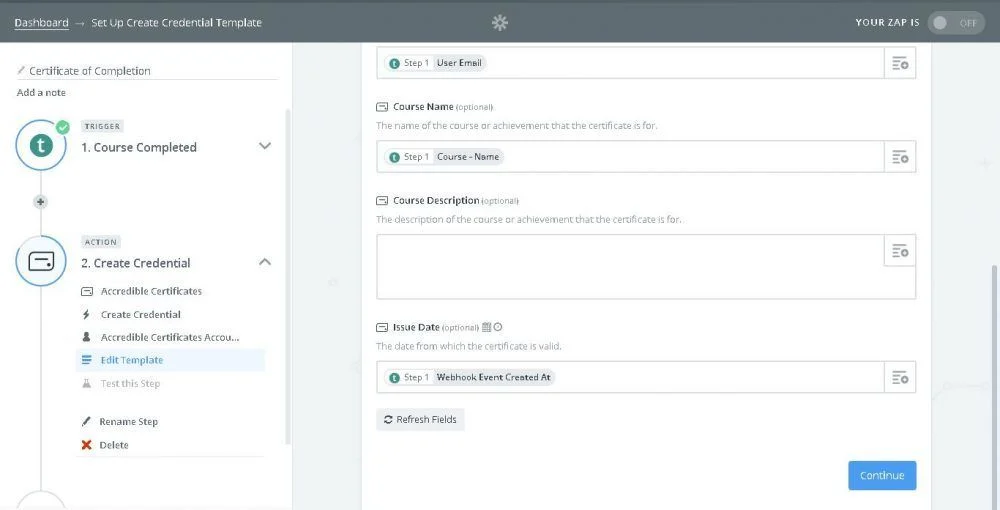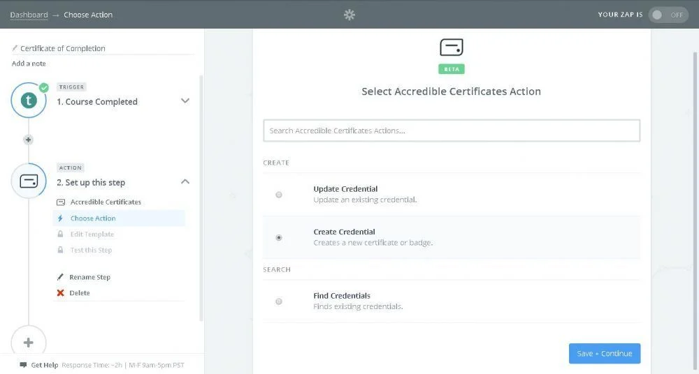 Next, you’ll need to select the appropriate Accredible Action for this automation. For this specific scenario, choose ‘Create Credential’ from the available options and proceed by clicking the continue button.