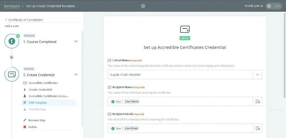 Verify the Accredible App functionality through testing and proceed if everything works as expected. Upon successful validation, select the Finish button and activate your Zap by turning it on.