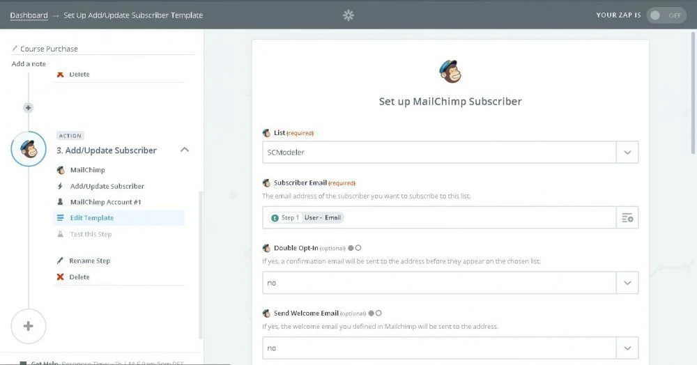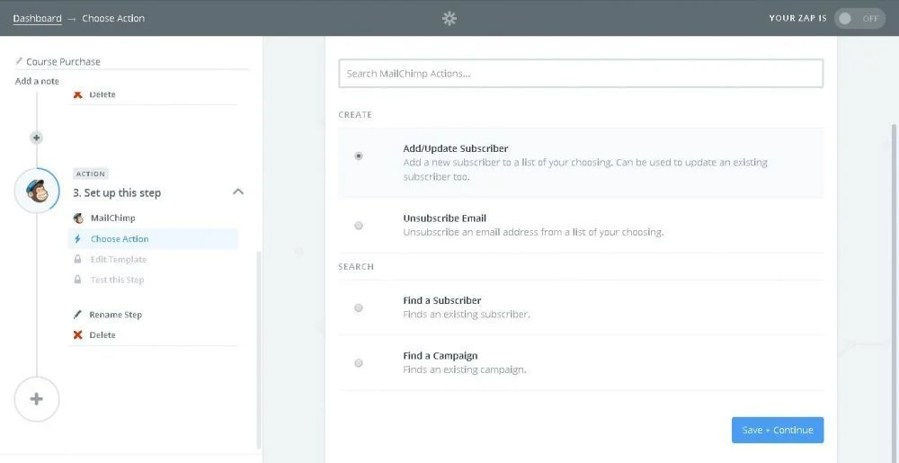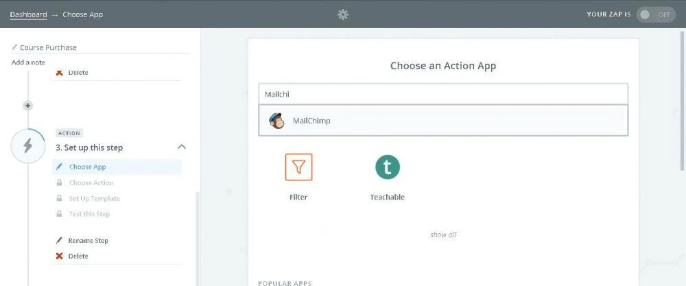Within Zapier, you’ll need to configure individual Zaps for each Teachable course. Let me demonstrate how you can accomplish this seamlessly with Mailchimp.