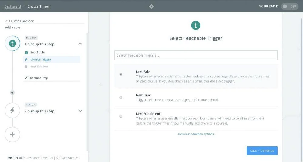Select ‘New Sale’  as your Teachable Trigger and click on the ‘Continue’ button.