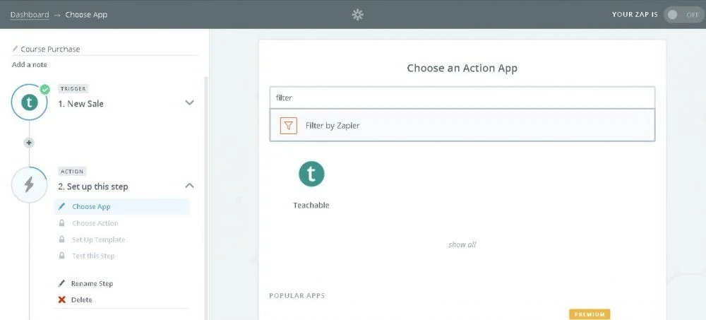 This represents a complete 3-step Zap workflow – consisting of a Trigger App, a Filter App, and an Action App. You’ll need to replicate this process by creating a similar Zap configuration for each course in your Teachable catalog.