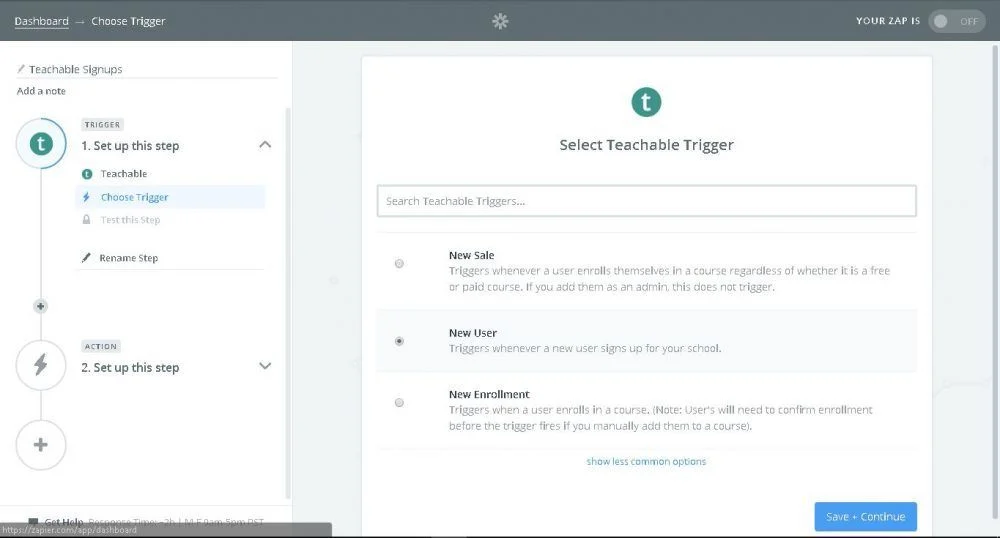 On the following screen, choose the appropriate Teachable Trigger, which in this scenario would be ‘New User,’ then click the ‘Save + Continue’ button.