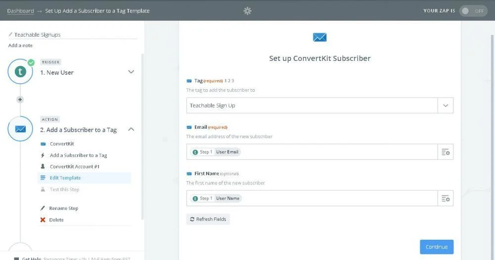Now you’ll need to choose the specific ConvertKit tag to which you want to assign new subscribers (note that this tag must already exist within your ConvertKit account), and then select which user information from Teachable you wish to transfer to ConvertKit.
