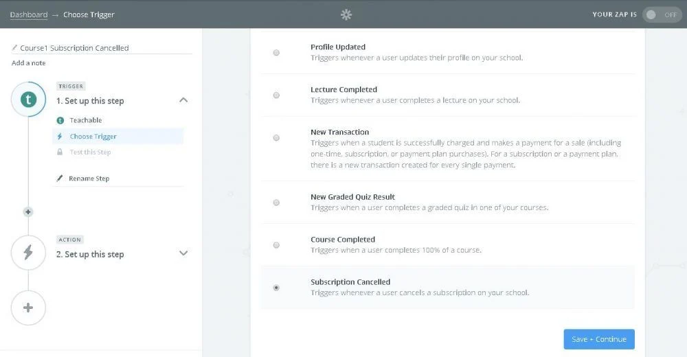 On the following screen, choose the appropriate Teachable Trigger, which in this scenario would be ‘Subscription Cancelled’ (you’ll find this option listed under the ‘show less common actions’ section).