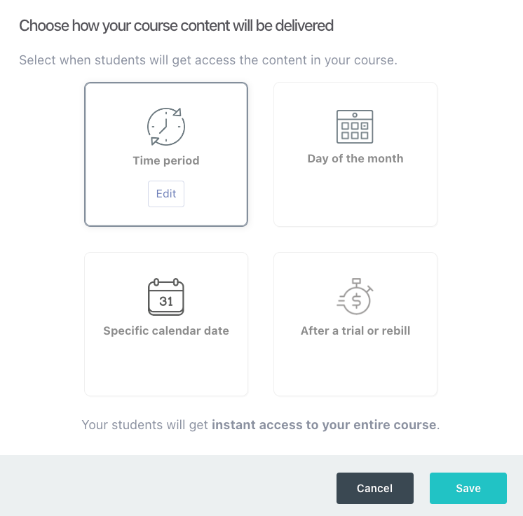 You can configure content to become accessible based on specific timing parameters, such as a set number of days following a student’s enrollment, on a predetermined calendar date, or on a particular day of each month.