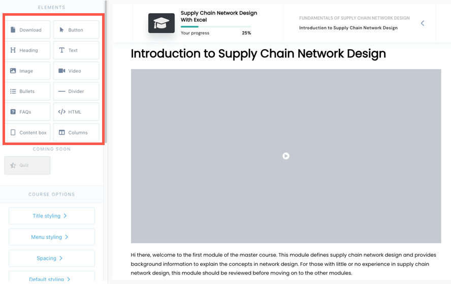 The Learn application features an intuitive drag-and-drop interface for constructing courses and a versatile editor for crafting lessons, although it notably lacks native video hosting. Additionally, it provides functionalities such as scheduled content release (drip content) and the ability to restrict access to certain materials (content locking).
