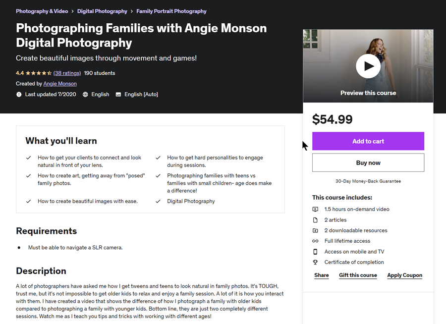 Angie Monson provides this family photography course on Udemy and enhances the learning experience with exclusive Facebook communities. Her dedicated group creates a collaborative space where family photographers can exchange knowledge and showcase their creative work.