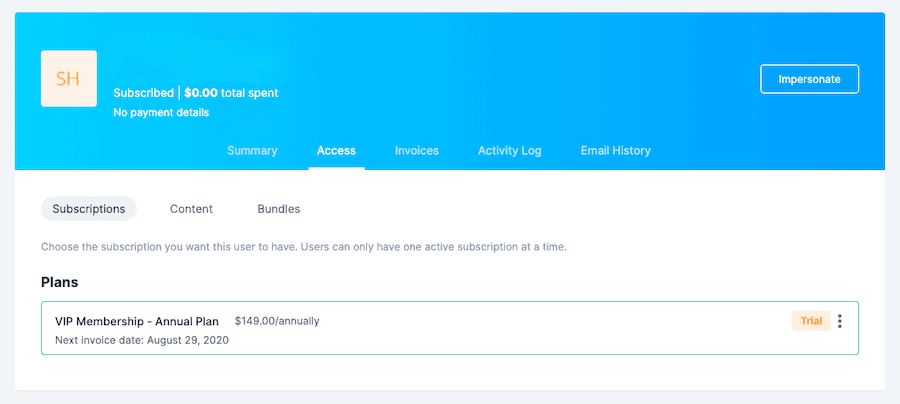 From this interface, you can also oversee what subscriptions or bundles a customer can access. This enables you to provide access to supplementary products, revoke permissions to existing content, process refunds, terminate their subscription or even adjust their next scheduled payment date.